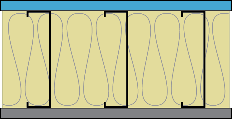 - 6” R-19 glass fiber insulation friction fit into stud cavity.