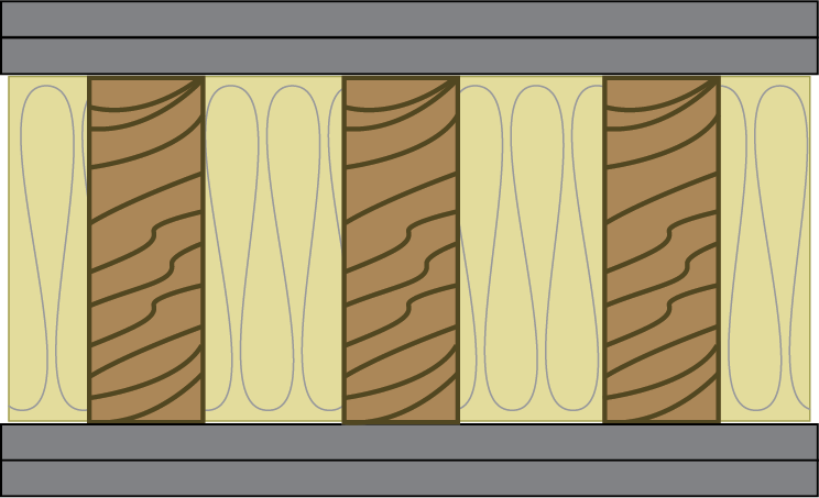 - 6-1/4”, R-19 glass fiber insulation friction fit into stud cavity.